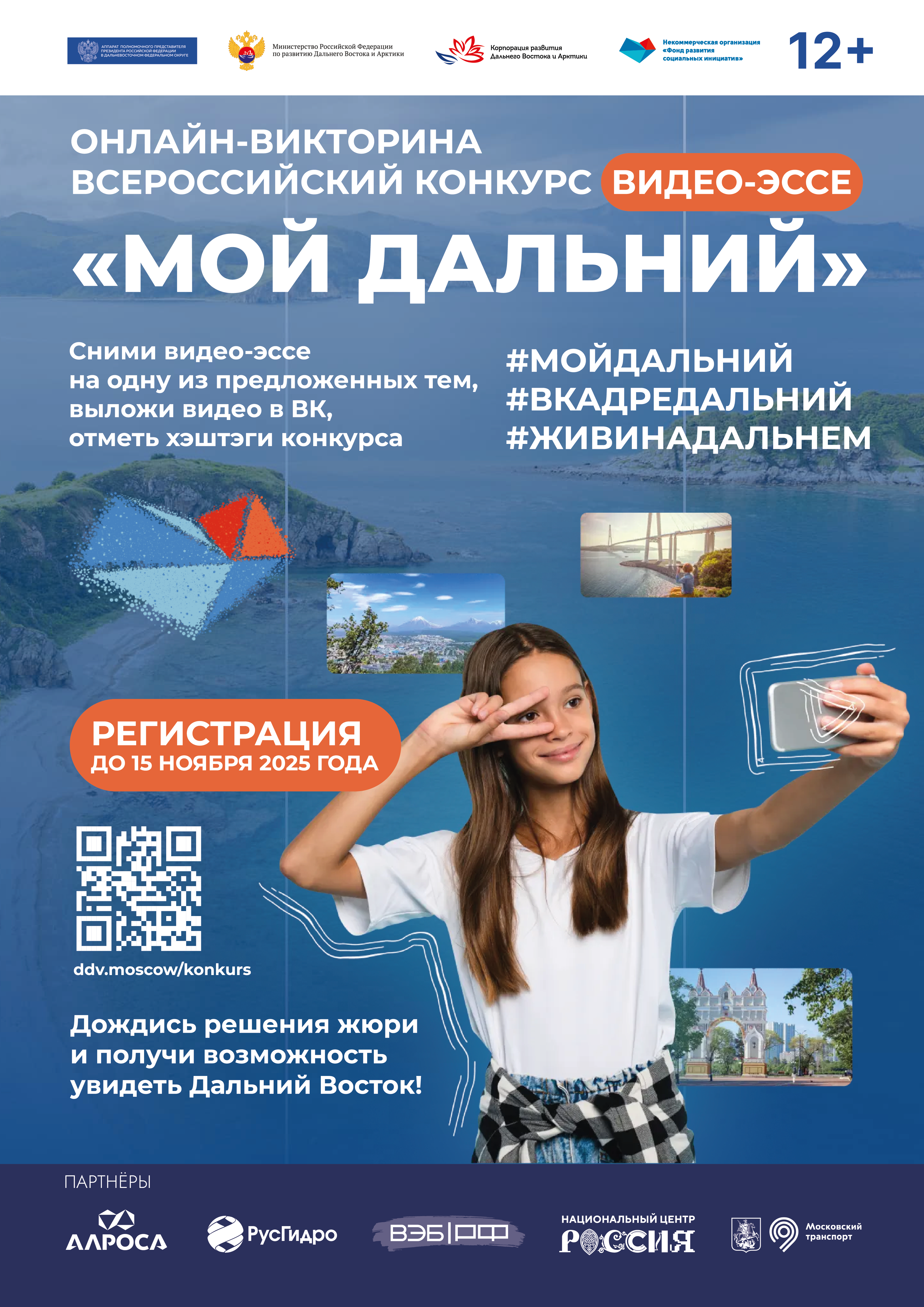 Приглашаем тебя присоединиться к Всероссийскому конкурсу видео-эссе «Мой Дальний» — масштабному образовательному проекту для активных ребят 14–18 лет! Это не просто конкурс, а уникальная возможность: