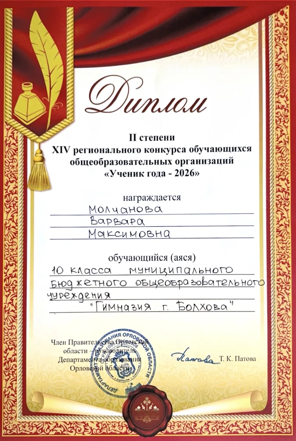 Поздравляем Молчанову Варвару - призëра регионального этапа Всероссийского конкурса "Ученик года - 2026"!