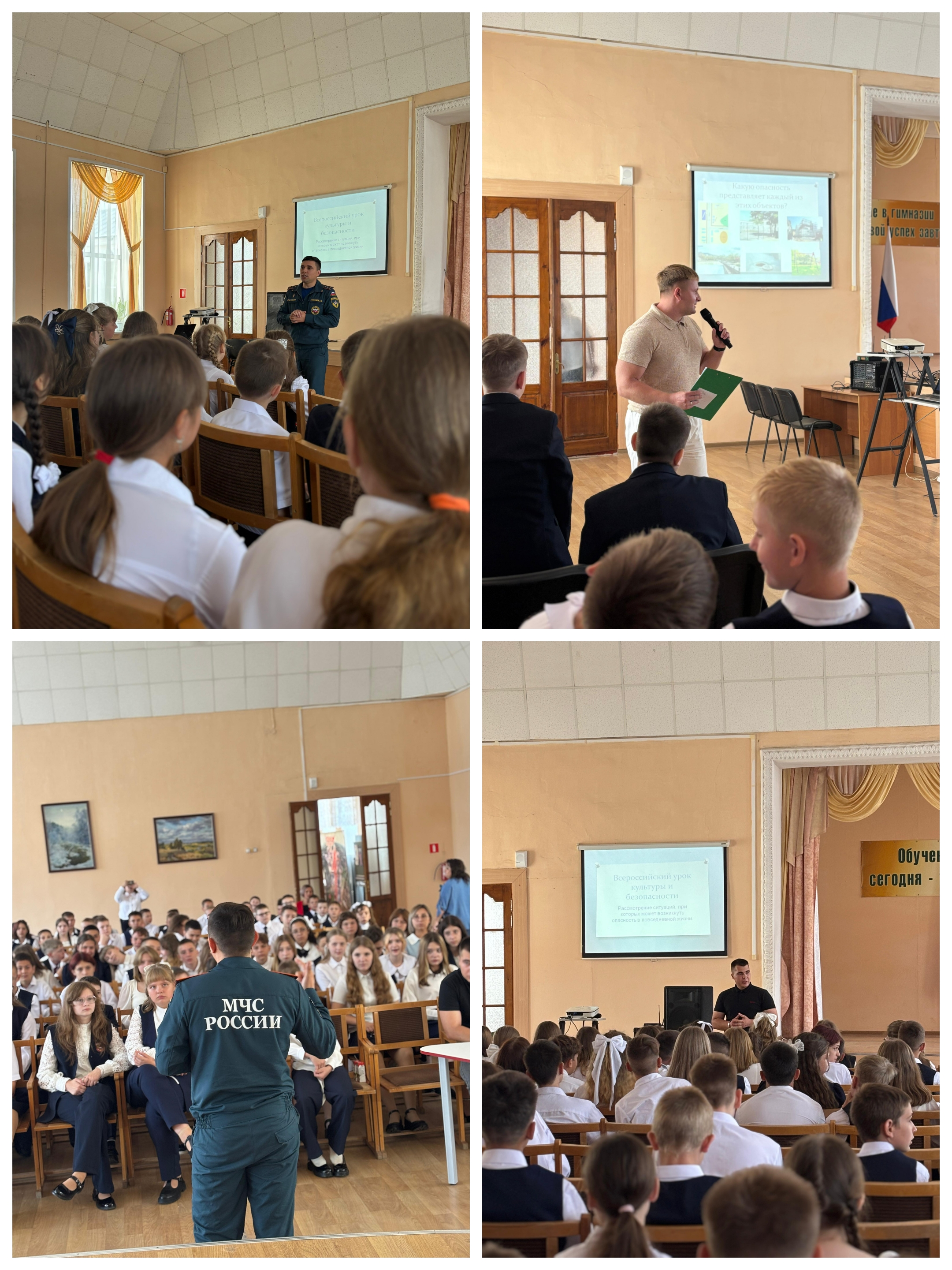 1 сентября в гимназии состоялся Всероссийский урок культуры безопасности, приуроченный к началу учебного года и посвященный правилам безопасного поведения в повседневной жизни и действиям в условиях различного рода чрезвычайных. В уроке принял участие старший инспектор ОНД по Болховскому району Александров Дмитрий Юрьевич и участник специальной военной операции Иванов Максим.